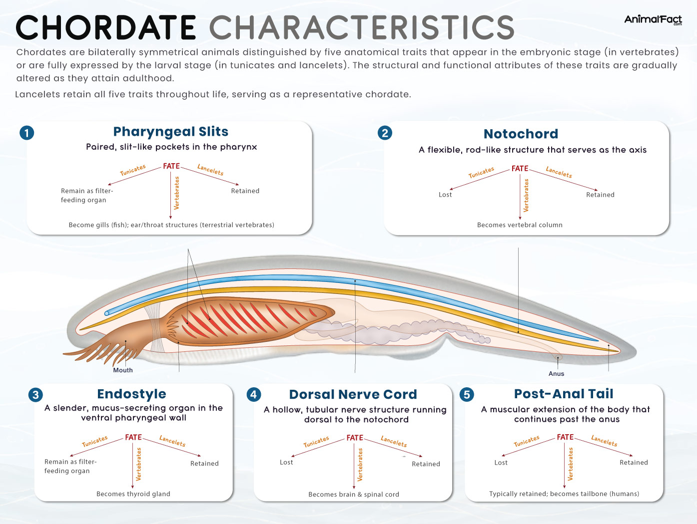 Chordates are bilaterally symmetrical animals, making up the third largest and the most diverse phyla in the animal kingdom, Chordata. They are distinguished by five characteristics: an elastic, rod-like notochord, a dorsal hollow nerve cord, an endostyle or thyroid gland, pharyngeal slits, and a post-anal tail. These features are present at some stage in their life cycle and are integral to their classification.