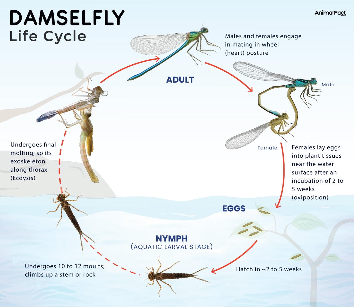 A nymph undergoes about a dozen moults, develops wingpads, and climbs out of the water onto a plant stem. Once perched, the skin on its thorax splits, metamorphosing into an adult. The hemolymph rushes into its small wings, which then become fully extended. Gradually, the stomach expands, too, followed by hardening and darkening of the exoskeleton in a few days.