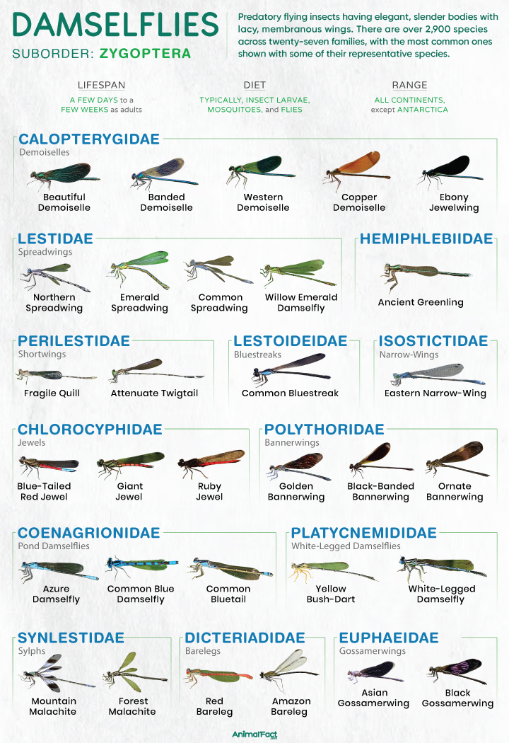 According to Dijkstra et al. 2013, 2014, there are 27 families of damselflies, as listed below.[1]