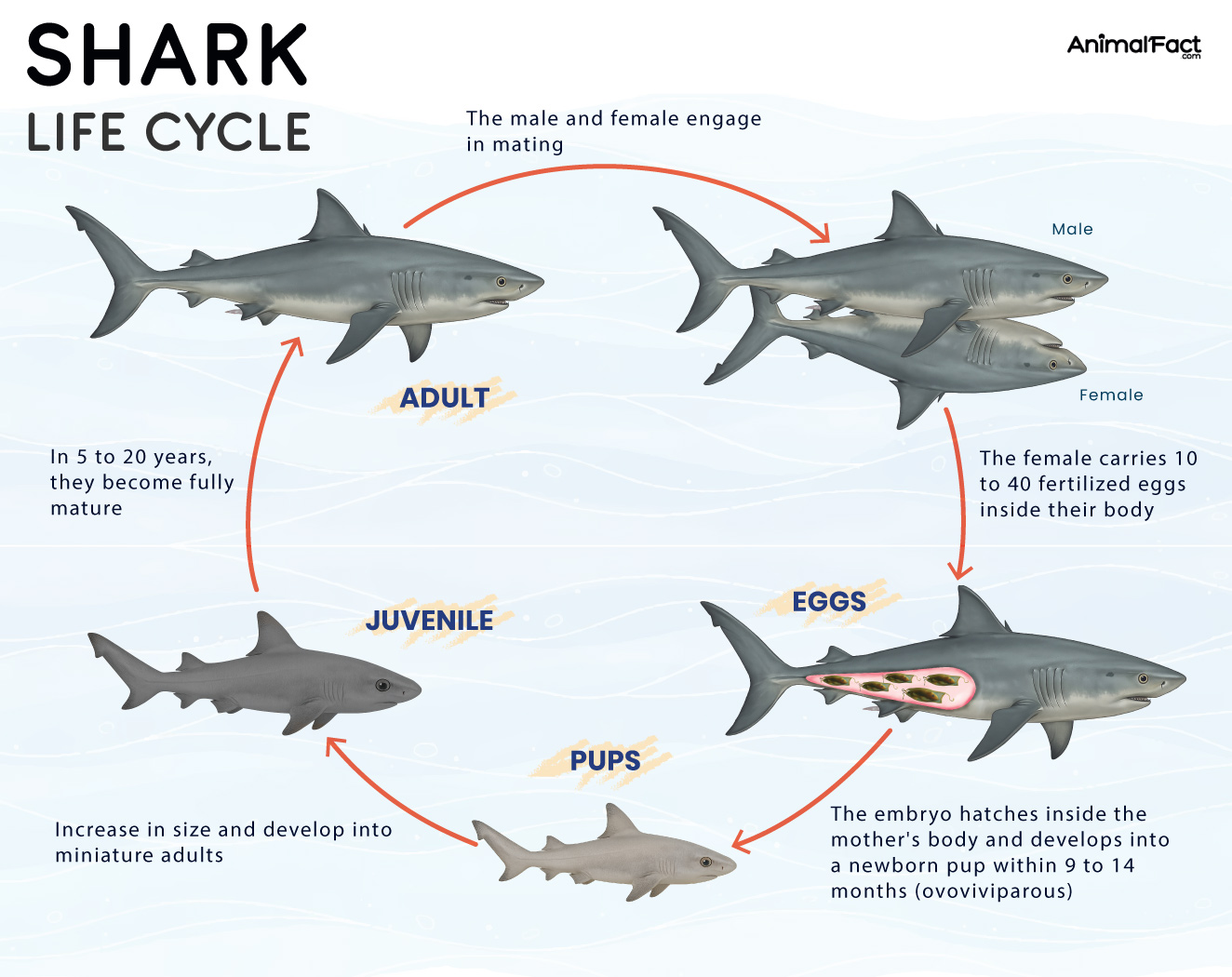 During mating season, mature sharks typically separate by sex. Males grip females with their teeth and insert their clasper into the female’s cloaca for internal fertilization. Pregnant females then separate from other similarly sized females. Although most sharks are ovoviviparous (eggs hatch within the parent’s body), some, like bull and hammerhead sharks, are viviparous and give birth to live young. When inside the eggs, the young are generally nourished by the yolk sac or even the egg capsule.