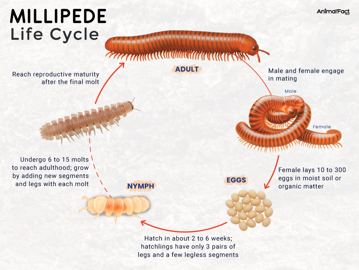 The eggs hatch into nymphs in about 2 to 6 weeks, with the hatchlings having only three pairs of legs and up to four legless segments. These nymphs undergo 6 to 15 molts, with newer segments and legs added with each molt. They attain sexual maturity after the final molt.