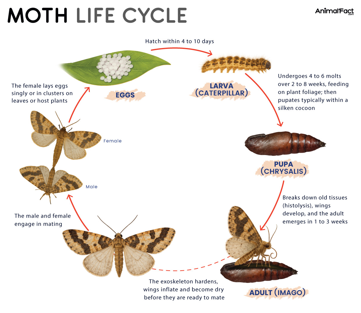 Like butterflies, moths are holometabolous insects that undergo complete metamorphosis through four distinct stages: egg, larva (caterpillar), pupa, and adult. As adults, most species feed primarily on floral nectar, which they extract using an elongated, straw-like mouthpart, the proboscis.