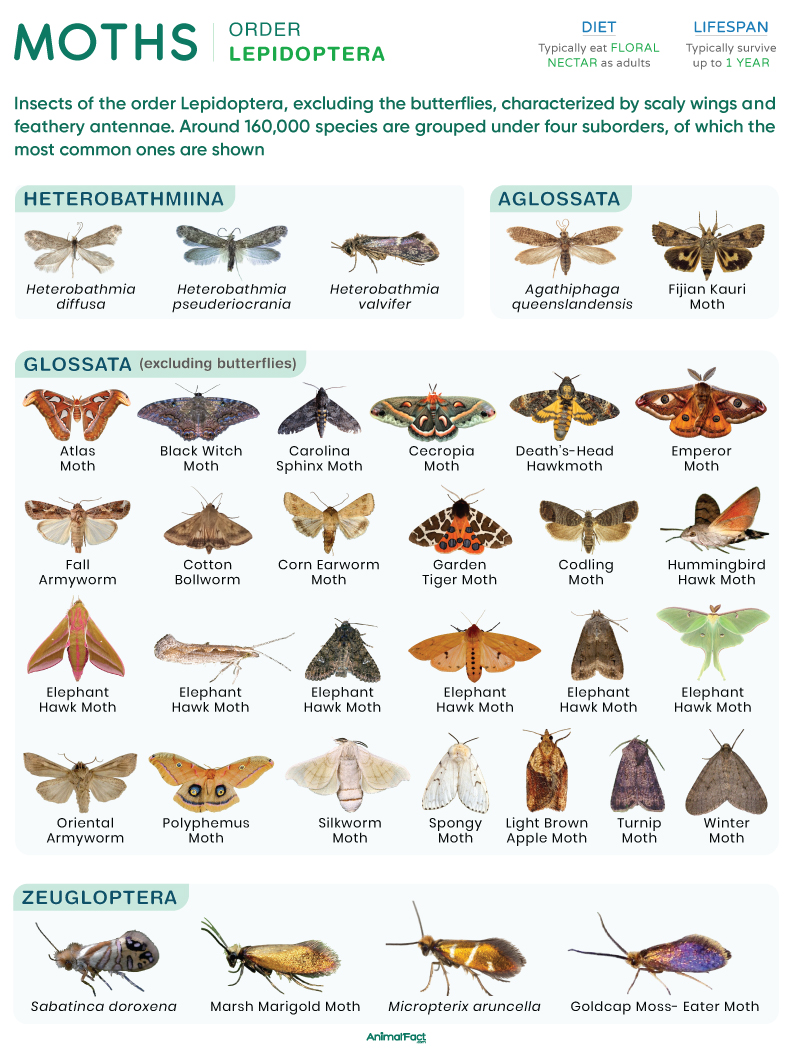 Moths are insects classified under the order Lepidoptera, including all members of the group except butterflies. They are typically distinguished from butterflies by their antennae, which are feathery or filamentous rather than clubbed. However, both moths and butterflies have scales on their forewings and hindwings, which confer their body coloration.