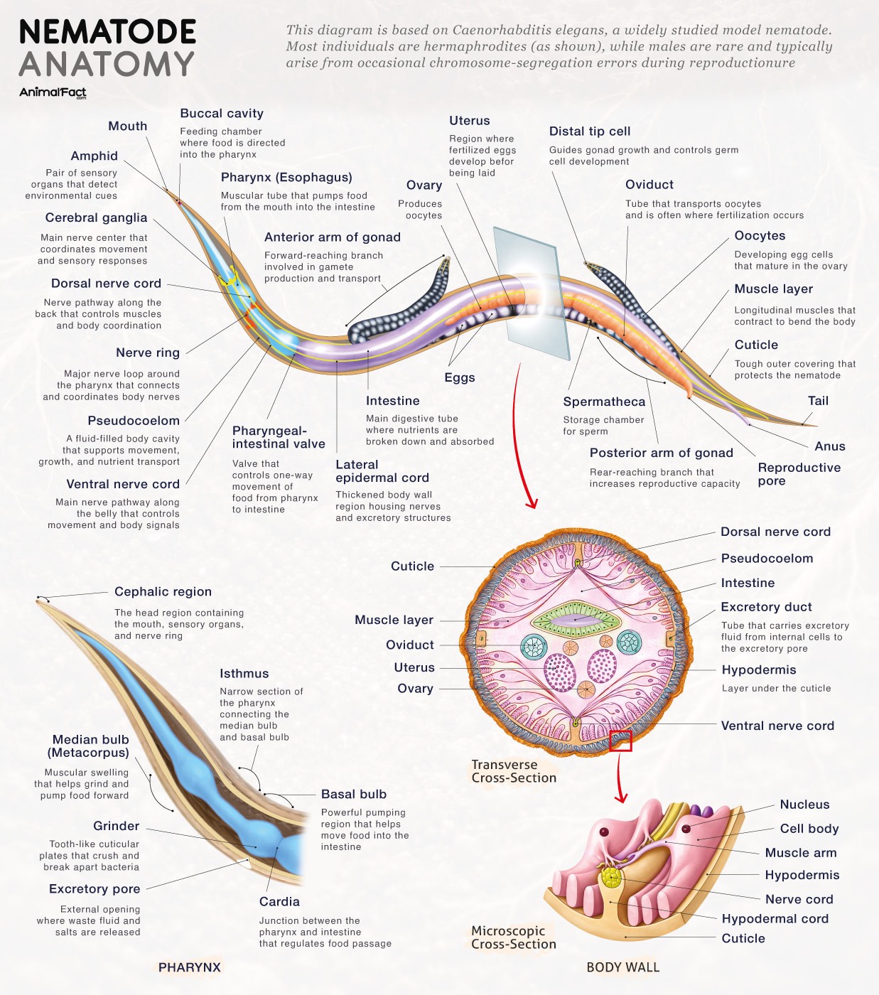 Most nematodes are dioecious, with separate males and females. Males are usually smaller and often have a bent or fan-shaped tail with sclerotized spicules for sperm transfer. Their amoeboid sperm crawl into the female’s reproductive tract and are stored in the spermatheca until fertilization. This sexual reproduction, involving the fusion of male and female gametes to form a diploid zygote, is called amphimixis.