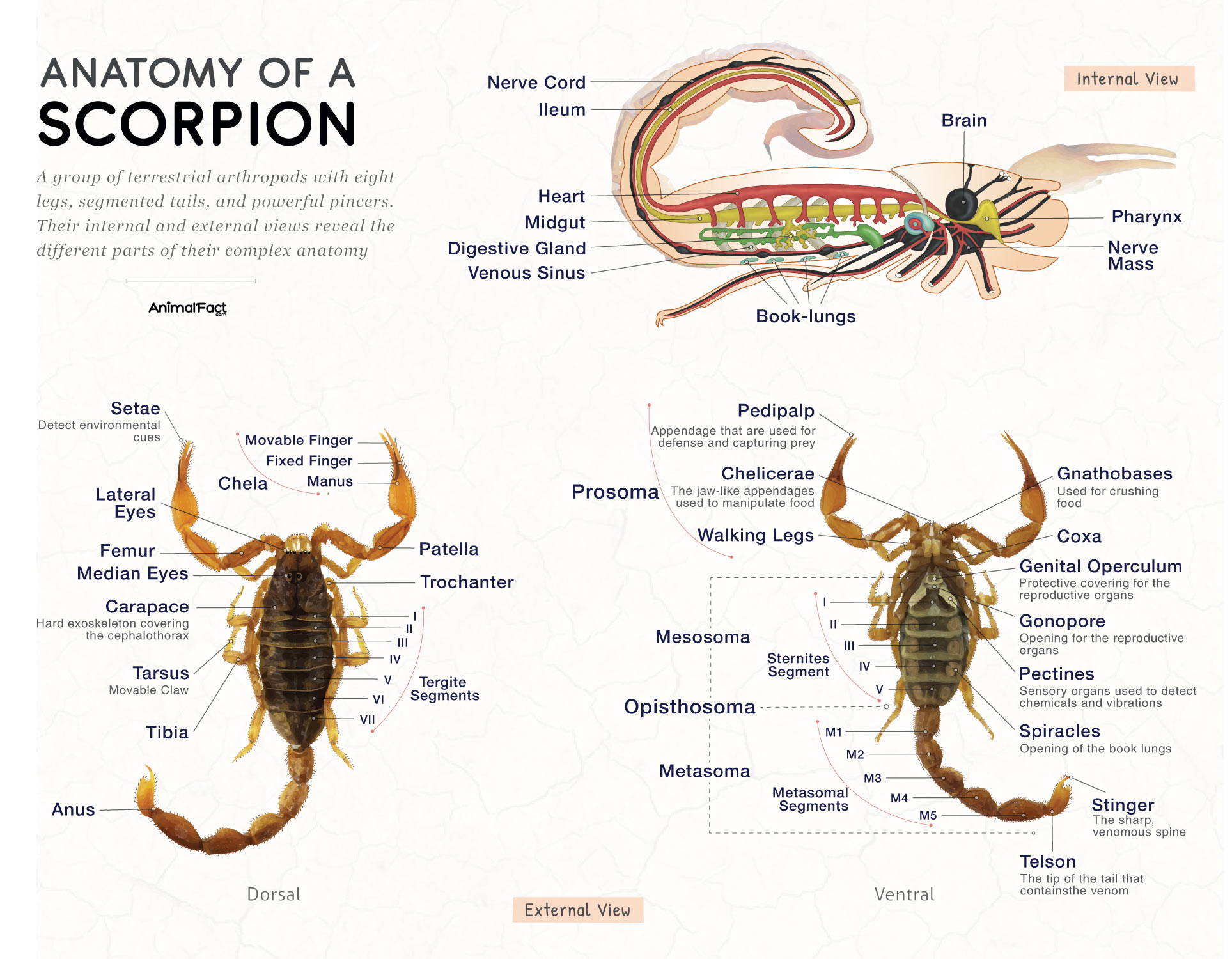 Unlike many other arachnids, scorpions exhibit viviparity, giving birth to live young instead of laying eggs. Before giving birth, the female elevates her body and joins the pedipalps and front legs to create a ‘birth basket’ to catch the emerging offspring.