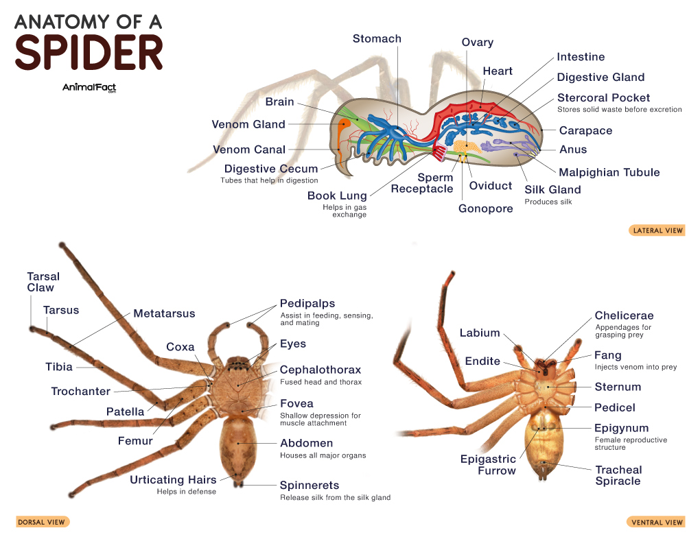 Like all arthropods, spiders have segmented bodies with jointed limbs covered in a tough cuticle made of chitin and proteins. Their heads are composed of several segments that fuse during embryonic development.
