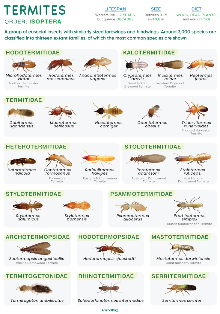 The name of the infraorder, Isoptera, stems from the Greek words iso (meaning equal) and ptera (meaning winged), which hint at the nearly equal size of the fore and hind wings. On the other hand, the common name, termite, comes from the Latin and Late Latin word termes, which refers to a ‘woodworm’ or ‘white ants.’