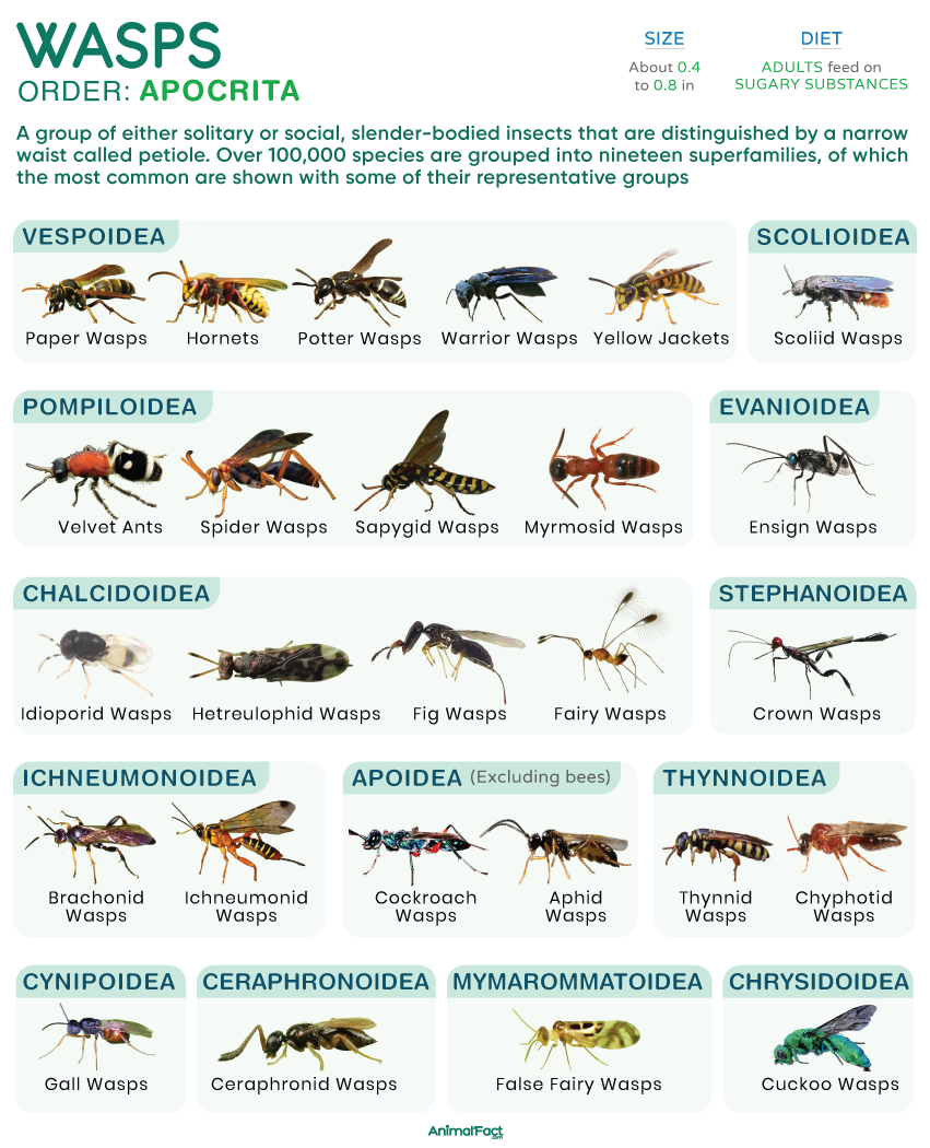Wasps represent a paraphyletic group within the suborder Apocrita, excluding bees (clade Anthophila) and ants (family Formicidae). All species are grouped into 19 superfamilies.